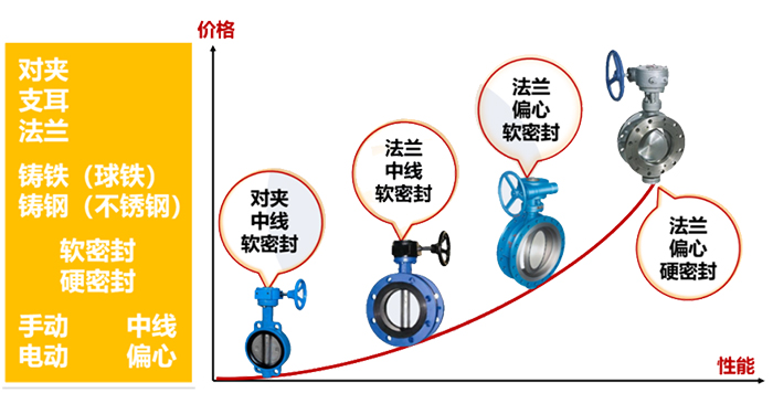 在性能和價格線圖中,我們可以看到閥門從對夾中線軟密封到法蘭偏心硬密封,在性能提高的同時,價格也是大幅的上漲。所以平時我們在確定蝶閥形式時,非必要工況應當最優化選擇。