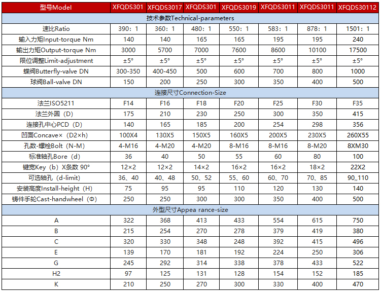該系列蝸輪箱適用環境廣、功能全面、形式多樣(有手輪式、手輪帶鎖式等),產品共有7種型號。