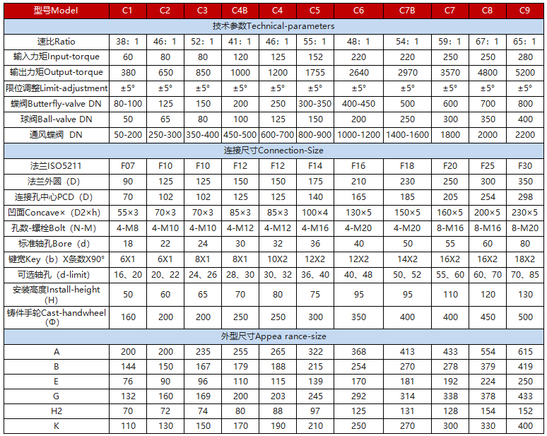 該系列蝸輪箱適用環境廣、功能全面、形式多樣(有手輪式、手輪帶鎖式、鏈輪式等),產品共有9種型號。